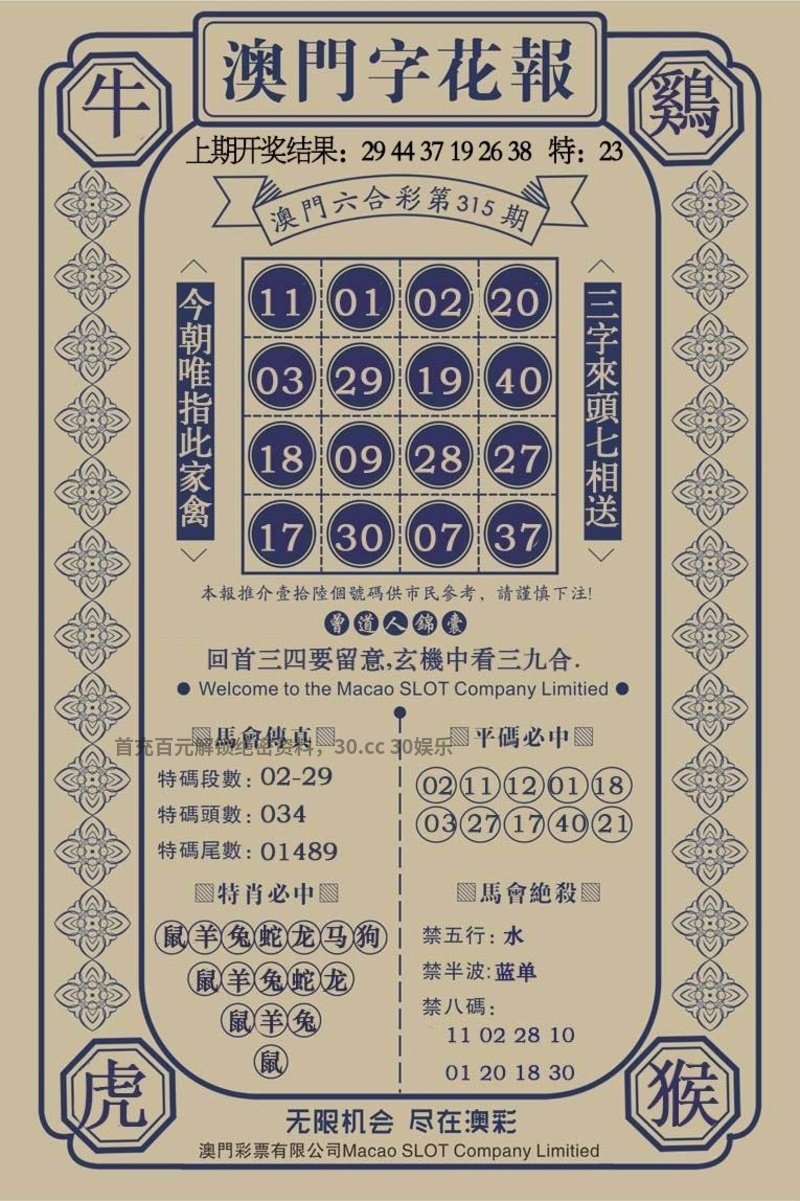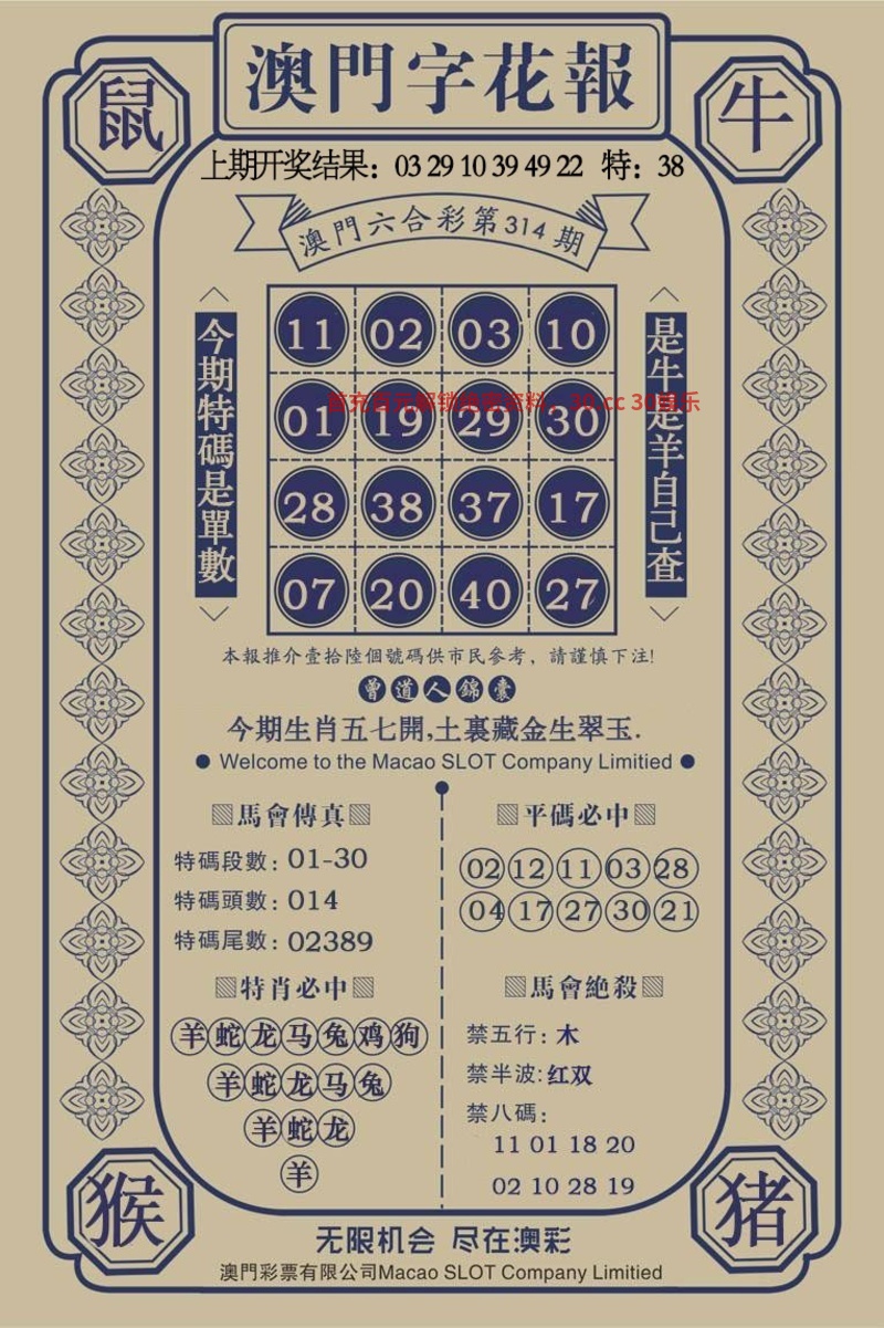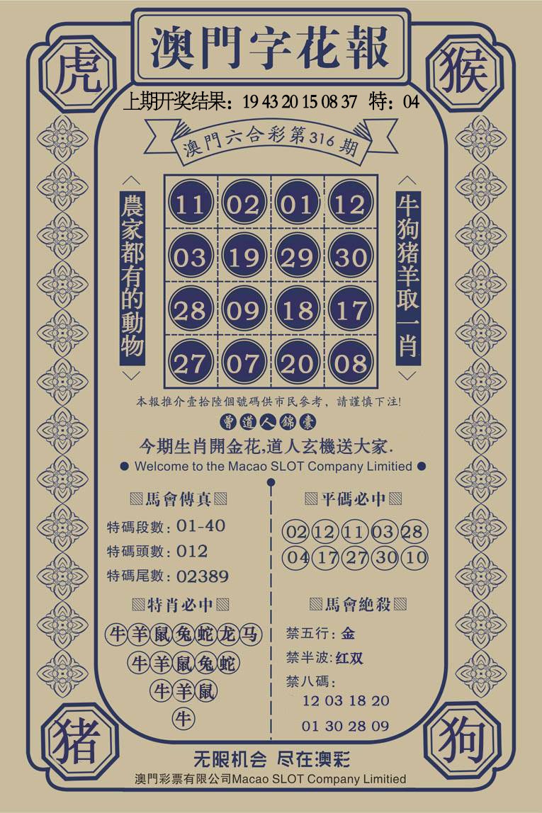 316期澳字花报【今期生肖開金花,道人玄機送大家】 解:今期生肖開金花,道人玄機送大家解蛇鸡虎猪马牛 综合取肖:蛇鸡虎猪马牛 |